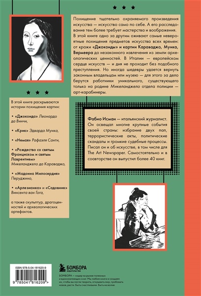 К счастью, значительная часть похищенного возвращается своим владельцам. И происходит это благодаря тому, что к делу подключаются арт-карабинеры. Такой отдел полиции, расследующий исключительно преступления, связанные с предметами искусства, существует только в Италии — стране, где их кражи регистрируются каждый день. Фабио Исман — журналист, много лет освещавший громкие события Италии и писавший об искусстве, — лично знаком со многими арт-карабинерами и как никто другой осведомлен о самых интересных случаях в их работе.