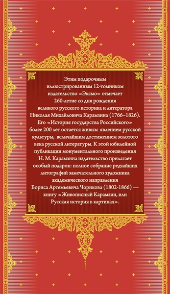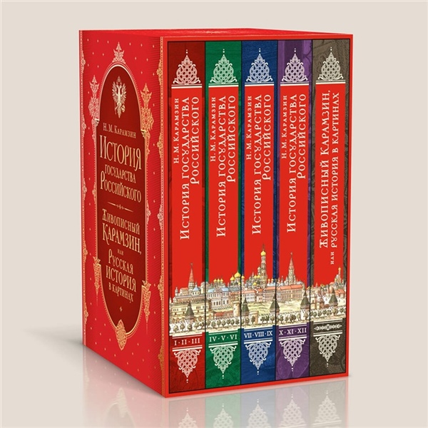 Этим подарочным иллюстрированным 12-томником в пяти книгах издательство «Эксмо» отмечает 260-летие со дня рождения великого русского историка и литератора Николая Михайловича Карамзина (1766—1826). Его «История государства Российского» более 200 лет остается живым явлением русской культуры, величайшим достижением золотого века русской литературы.