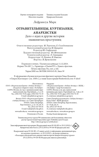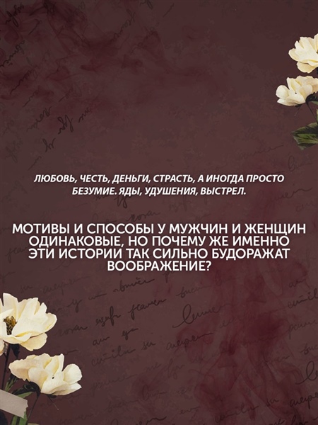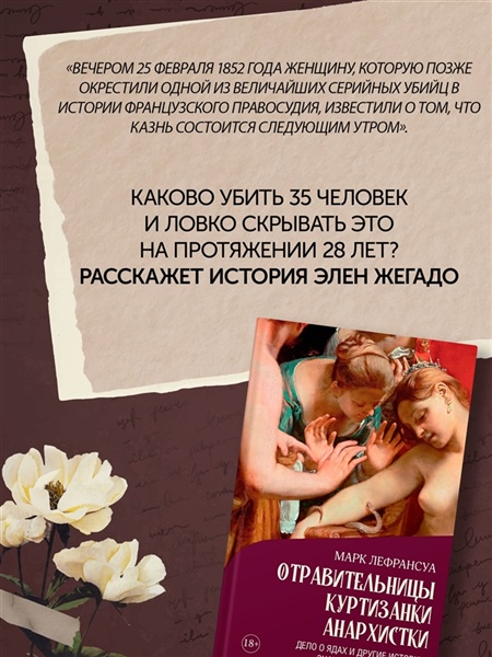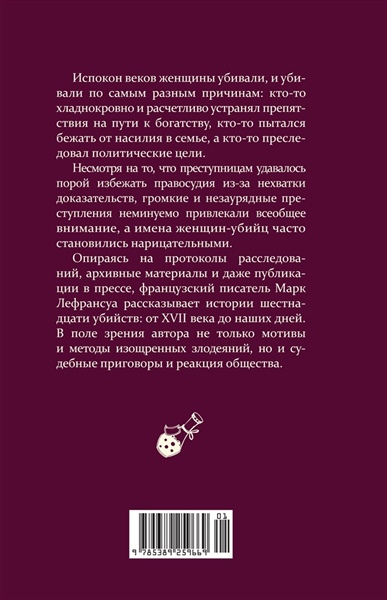 Что толкало женщин на убийства? Как судили преступниц и как к ним относилось общество? В своей книге французский писатель Марк Лефрансуа в подробностях рассказывает о преступницах прошлого: разгневанных женах и непокорных дочерях, бесстрашных революционерках и хладнокровных серийных убийцах. Драматургия и трагедии прошлого разворачиваются в исторических декорациях от XVII века до наших дней.