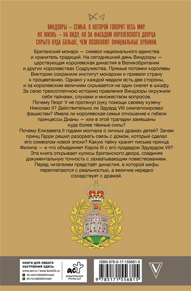Виндзоры — семья, о которой говорит весь мир. Их жизнь — на виду, но за фасадом королевского дворца скрыто куда больше, чем позволяютофициальные хроники. Британский монарх — символ национального единства и хранитель традиций. На сегодняшний день Виндзоры — царствующая королевская династия в Великобритании и других королевствах Содружества. Прямые потомки королевы Виктории сохранили институт монархии и привели страну к процветанию. Однако у каждой медали есть две стороны, и за королевским величием скрывается не один скелет в шкафу. За свою трехсотлетнюю историю правления Виндзоры окружили себя тайнами, слухами и множеством вопросов. Почему Георг V не протянул руку помощи своему кузену Николаю II? Действительно ли Эдуард VIII симпатизировал фашистам? Имела ли королевская семья отношение к гибели принцессы Дианы — или в этой трагедии замешаны куда более темные силы? Почему Елизавета II годами молчала о личных драмах детей? Зачем принц Гарри решил разорвать связь с домом, который сделал его символом новой эпохи? Какую тайну хранят письма принца Филипа — и что объединяет Карла III с его прадедом Эдуардом VII? Эта книга открывает кулисы британского двора, соединяя документальную точность с захватывающим повествованием. Перед читателем предстаёт династия, в которой мифы переплетаются с реальностью, а величие нередко соседствует с драмой.