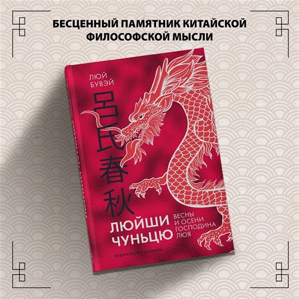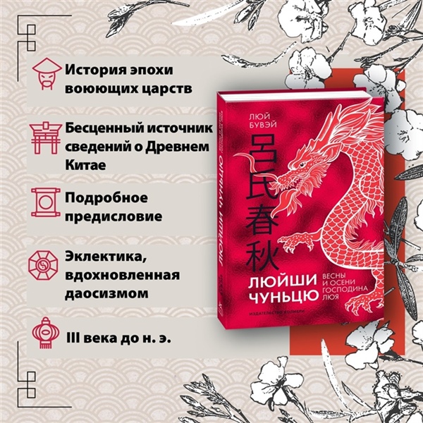 Люй Бувэй (ок. 291–235 до н. э.) — культурный и политический деятель доимперского Китая, человек яркий и амбициозный, который путем сложных интриг и дерзких авантюр пришел к власти сам, став канцлером при дворе царства Цинь, и взрастил будущего первого императора Китая — Цинь Шихуан-ди. Долгое время оставаясь фактическим правителем государства, Люй Бувэй уделял значительное внимание культуре. Он пригласил в Цинь более тысячи ученых различных философских школ и направлений мысли, инициируя уникальный проект по сосредоточению и унификации интеллектуального богатства Китая в едином трактате, создав своего рода философскую энциклопедию, вобравшую литературное, историческое, прикладное знание и мифопоэтические воззрения своего времени — «Люйши чуньцю» («Весны и осени господина Люя»). «Люйши чуньцю» можно отнести к жанру философской эклектики. Военное дело и землепашество, астрономические наблюдения, музыка, ритуалы, законы и традиции — все нашло отражение в этом древнем памятнике, вдохновленном философией даосизма. Синкретический характер и художественные достоинства «Люйши чуньцю», разнообразие тем, объем и богатство материала делают его бесценным источником сведений о Древнем Китае и одной из драгоценных жемчужин мирового культурного наследия.