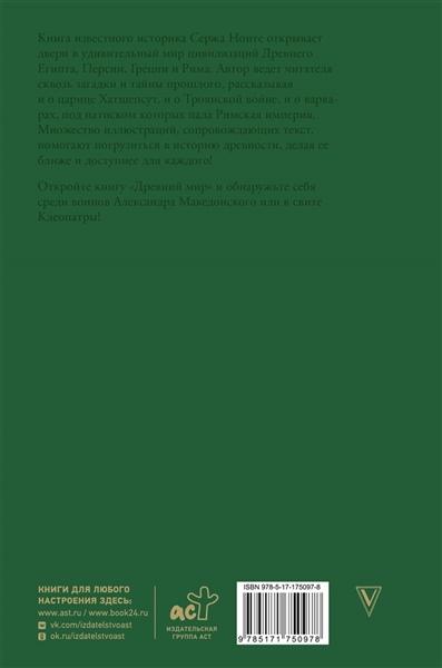 Книга известного историка Сержа Нонте открывает двери в удивительный мир цивилизаций Древнего Египта, Персии, Греции и Рима. Автор ведет читателя сквозь загадки и тайны прошлого, рассказывая и о царице Хатшепсут, и о троянской войне, и о варварах, под натиском которых пала Римская империя. Множество иллюстраций, сопровождающих текст, помогают погрузиться в историю древности, делая ее ближе и доступнее для каждого! Откройте книгу "Древний мир" и обнаружьте себя среди воинов Александра Македонского или в свите Клеопатры!
