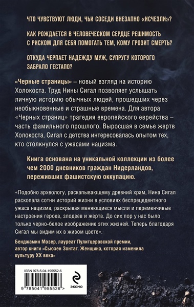 Что чувствуют люди, чьи соседи внезапно «исчезли»? Как рождается в человеческом сердце решимость с риском для себя помогать тем, кому грозит смерть? Откуда черпает надежду муж, супругу которого забрало гестапо? «Черные страницы» — новый взгляд на историю Холокоста. Труд Нины Сигал позволяет услышать личную историю обычных людей, прошедших через необыкновенные и страшные времена. Для автора «Черных страниц» трагедия европейского еврейства — часть фамильного прошлого. Выросшая в семье жертв Холокоста, Сигал с детства интересовалась опытом тех, кто столкнулся с ужасами нацизма. Книга основана на уникальной коллекции из более чем 2000 дневников граждан Нидерландов, переживших фашистскую оккупацию. «Подобно археологу, раскапывающему древний храм, Нина Сигал раскопала сотни историй жизни в условиях беспрецедентного ужаса нацизма, раскрывая меняющиеся мысли и переменчивые настроения героев, злодеев и жертв. До сих пор у нас было только черно-белое изображение этих жизней. Теперь, благодаря Сигал, мы видим их в живом цвете», — Бенджамин Мозер, лауреат Пулитцеровской премии, автор книг «Зонтаг»