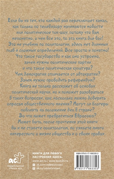 Если вы из тех, кто каждый раз переключает канал, как только по телевизору начинаются новости или политическое ток-шоу, потому что вам непонятно, о чём всё это, то эта книга для вас! Это не учебник по политологии, здесь нет длинных глав и сложных определений. Все просто и понятно! Что такое государство и как оно устроено, зачем нужны политические партии и что такое политическая культура? Чем демократия отличается от автократии? Зачем нужно проводить референдум? Книга не только расскажет об основах политической науки, но и поможет разобраться в таких вопросах, как: насколько можно доверять опросам общественного мнения, могут ли блогеры повлиять на положение дел в стране, во что может превратиться Евросоюз? Может быть, после прочтения этой книги вы и не станете политологом, но узнаете много интересного о жизни общества и о своих правах.