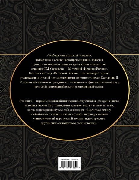 "Учебная книга русской истории", положенная в основу настоящего издания, является кратким изложением главного труда жизни знаменитого историка С.М. Соловьева — 29-томной "Истории России". Как известно, над "Историей России", охватывающей период от зарождения русской государственности до "золотого века" Екатерины II, Соловьев работал около тридцати лет, вложив в этот фундаментальный труд весь свой незаурядный опыт и многогранный талант.