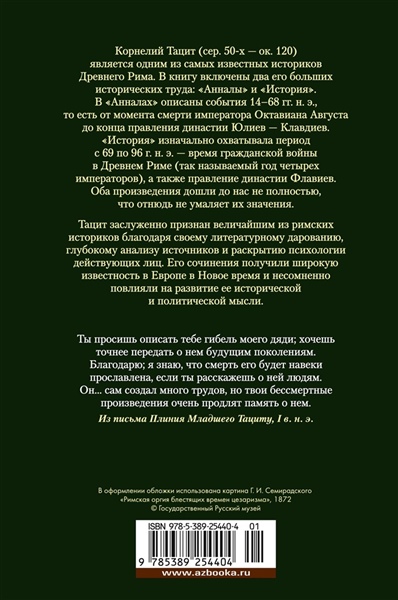 Корнелий Тацит (сер. 50-х — ок. 120) является одним из самых известных историков Древнего Рима. В книгу включены два его больших исторических труда: «Анналы» и «История».В «Анналах» описаны события 14–68 гг. н. э., то есть от момента смерти императора Октавиана Августа до конца правления династии Юлиев — Клавдиев. «История» изначально охватывала период с 69 по 96 г. н. э. — время гражданской войны в Древнем Риме (так называемый год четырех императоров), а также правление династии Флавиев. Оба произведения дошли до нас не полностью, что отнюдь не умаляет их значения. Тацит заслуженно признан величайшим из римских историков благодаря своему литературному дарованию, глубокому анализу источников и раскрытию психологии действующих лиц. Его сочинения получили широкую известность в Европе в Новое время и несомненно повлияли на развитие ее исторической и политической мысли.