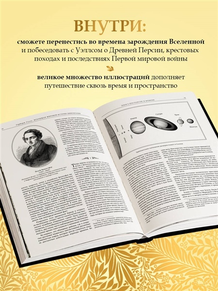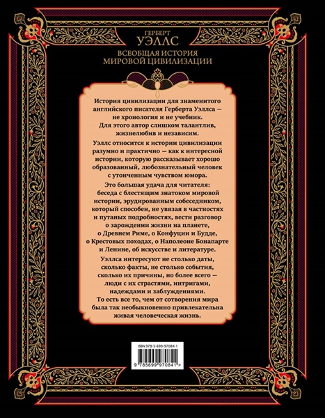 Такого Герберта Уэллса отечественные ценители книги почти не знают — знаменитый писатель-фантаст выступает в этой книге как блестящий знаток истории, эрудированный собеседник, способный, не увязая в деталях и путаных подробностях, вести разговор о Древнем Риме, о Конфуции и принце Гаутаме, о крестовых походах и личности Наполеона Бонапарта. Эту книгу уж никак не назовешь учебником — ее автор слишком жизнелюбив и самостоятелен. Уэллс относится к истории цивилизации разумно и просто: как хорошо образованный и очень любознательный человек к увлекательному явлению. Его интересует то же самое, что и любого ценителя «исторического чтения»: факты, события, но главное — люди с их страстями, интригами, надеждами и заблуждениями. То есть все то, чем от сотворения мира была так необыкновенно привлекательна живая человеческая жизнь. «Эта книга, словно первопроходец, откроет то, что современные мужчины и женщины могут узнать о прошлом, о себе и о том, как прожить сегодняшний день». Герберт Уэллс