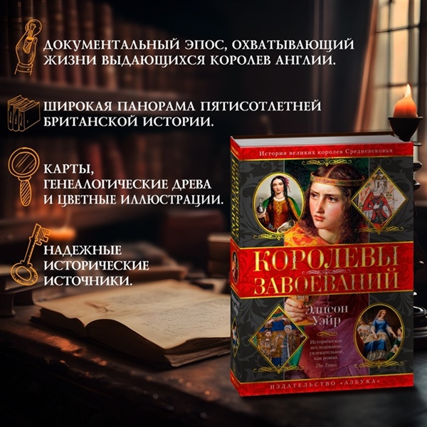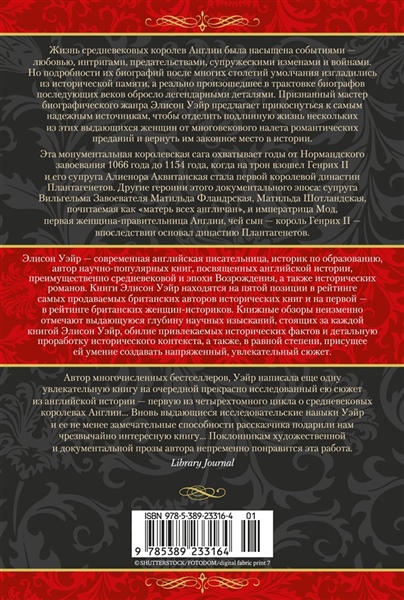 Жизнь средневековых королев Англии была насыщена событиями — любовью, интригами, предательствами, супружескими изменами и войнами. Но подробности их биографий после многих столетий умолчания изгладились из исторической памяти, а реально произошедшее в трактовке биографов последующих веков обросло легендарными деталями. Признанный мастер биографического жанра Элисон Уэйр предлагает прикоснуться к самым надежным источникам, чтобы отделить подлинную жизнь нескольких из этих выдающихся женщин от многовекового налета романтических преданий и вернуть им законное место в истории. Эта монументальная королевская сага охватывает годы от Нормандского завоевания 1066 года до 1154 года, когда на трон взошел Генрих II и его супруга Алиенора Аквитанская стала первой королевой династии Плантагенетов. Другие героини этого документального эпоса: супруга Вильгельма Завоевателя Матильда Фландрская, Матильда Шотландская, почитаемая как «матерь всех англичан», и императрица Мод, первая женщина-правительница Англии, чей сын — король Генрих II — впоследствии основал династию Плантагенетов.