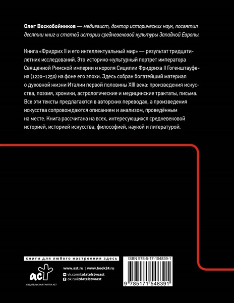 Книга "Фридрих II и его интеллектуальный мир" — результат тридцатилетних исследований. Это историко-культурный портрет императора Священной Римской империи и короля Сицилии Фридриха II Гогенштауфена (1220–1250) на фоне его эпохи. Здесь собран богатейший материал о духовной жизни Италии первой половины XIII века: произведения искусства, поэзия, хроники, астрологические и медицинские трактаты, письма. Все эти тексты предлагаются в авторских переводах, а произведения искусства сопровождаются описанием и анализом, проведённым на месте. Книга рассчитана на всех, интересующихся средневековой историей, историей искусства, философией, наукой и литературой.