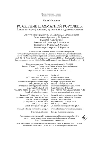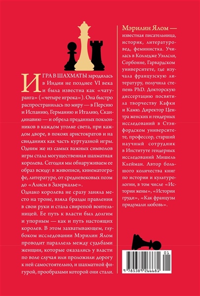 Королева — самая могущественная фигура на шахматной доске. Однако так было не всегда: шахматы не одно столетие существовали без королевы, пока она наконец не явила себя на страницах древнего манускрипта, хранящегося в аббатстве в Швейцарии. Как она оказалась на шахматной доске? Какая из могущественных королев Средневековья стала вдохновением для этого образа? И как его развитие отражало положение женщин у власти в реальной жизни? В повествовании выдающегося историка и феминистки Мэрилин Ялом оживают влиятельные правительницы прошлого: Матильда Тосканская и донья Уррака, Алиенора Аквитанская и Бланка Кастильская, Сигрид Гордая и Екатерина II. Ялом прослеживает удивительный и непредсказуемый путь королевы на шахматной доске от самых первых редких упоминаний этой фигуры до ее блистательного возвышения в эпоху правления Изабеллы Кастильской, от шахмат острова Льюис и средневековых поэм до «Алисы в Зазеркалье». Это многослойная, захватывающая история средневековых королевских дворов, борьбы за власть, политических и любовных интриг. По сей день сила шахматной королевы отражает то, как на протяжении столетий женщины стремились к независимости и обретали ее.