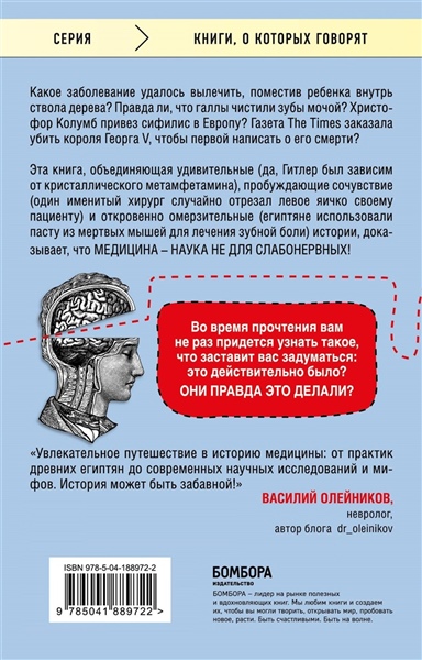В этой книге собраны самые причудливые и, тем не менее, реальные факты о медицинских знаниях древних, о гипотезах и экспериментах врачей прошлого, о лекарствах и процедурах, имевших место в истории медицины. Но ее автор не ограничился историями из прошлого и включил в нее специфические вопросы, которые вызывают любопытство и у современных людей: например, отчего появляются бородавки, сходят ли люди с ума в полнолуние и какой процент мозга мы используем.
