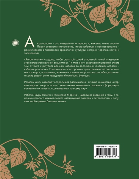 "Антропология" создана, чтобы стать той самой отправной точкой в изучении этой непростой научной дисциплины. 14 глав книги охватывают широкий спектр тем: от быта и ритуалов древних народов до достижений новейшей отрасли — киберантропологии. Издание дает всестороннее представление об антропологии как науки, показывает, на какие насущные вопросы она способна дать ответ и какие задачи стоят перед ней в ближайшем будущем. Разделы книги содержат вопросы для размышлений, а также множество интервью ведущих антропологов с уникальными выводами и теориями, сформулированными в их полевых исследованиях по всему миру. Работа Лауры Паунти и Томислава Марича — идеальное введение в тему, с помощью которого каждый сможет найти нужные подходы к антропологии и получить необходимые базовые знания.