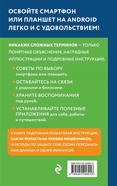 Эта книга создана специально для тех, кто хочет научиться уверенно пользоваться смартфоном или планшетом на Android — без лишних сложностей и технических терминов: просто, наглядно и комфортно. Вы узнаете, как выбрать подходящее устройство на Android, а пошаговые инструкции, крупный шрифт и наглядные иллюстрации помогут вам быстро научиться звонить, писать сообщения, устанавливать приложения, делиться фотографиями и пользоваться интернетом. Автор также подробно рассказывает о всех возможностях защиты от мошенников, сохранения личных данных и безопасности своих финансов.