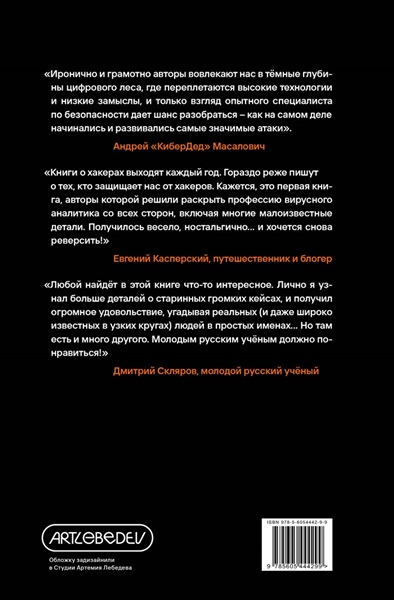 «Иронично и грамотно авторы вовлекают нас в темные глубины цифрового леса, где переплетаются высокие технологии и низкие замыслы, и только взгляд опытного специалиста по безопасности дает шанс разобраться — как на самом деле начинались и развивались самые значимые атаки». — Андрей «КиберДед» Масалович