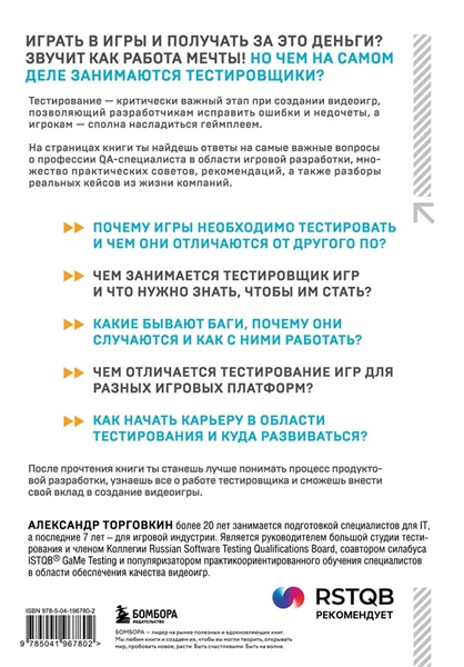 Играть в игры и получать за это деньги? Звучит как работа мечты! Но чем на самом деле занимаются тестировщики? Тестирование — критически важный этап при создании видеоигр, позволяющий разработчикам исправить ошибки и недочеты, а игрокам — сполна насладиться геймплеем. На страницах книги ты найдешь ответы на самые важные вопросы о профессии QA-специалиста в области игровой разработки, множество практических советов, рекомендаций, а также разборы реальных кейсов из жизни компаний. • Почему игры необходимо тестировать и чем они отличаются от другого ПО? • Чем занимается тестировщик игр и что нужно знать, чтобы им стать? • Какие бывают баги, почему они случаются и как с ними работать? • Чем отличается тестирование игр для разных игровых платформ? • Как начать карьеру в области тестирования и куда развиваться? После прочтения книги ты станешь лучше понимать процесс продуктовой разработки, узнаешь все о работе тестировщика и сможешь внести свой вклад в создание видеоигры. Об авторе Александр Торговкин более 20 лет занимается подготовкой специалистов для IT, а последние 7 лет — для игровой индустрии. Является руководителем большой студии тестирования и членом Коллегии Russian Software Testing Qulifications Board, соавтором силабуса ISTQB® GaMe Testing и популяризатором практикоориентированного обучения специалистов в области обеспечения качества видеоигр.
