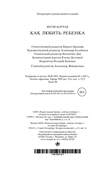 «Как любить ребенка» — одна из самых известных книг о воспитании. В основу своей педагогики Януш Корчак положил чудесный сплав любви и уважения к ребенку, которому, как и взрослому, требуется свобода для самовыражения и самостоятельного познания окружающего мира. В этой доброй, искренней книге читатели найдут как ценные практические рекомендации, так и увлекательные рассказы и размышления о проблемах и радостях, связанных с взрослением и самоопределением человека. На протяжении многих десятилетий работа Корчака «Как любить ребенка» служила настольной книгой родителям по всему миру и даже была названа «Библией по воспитанию детей».