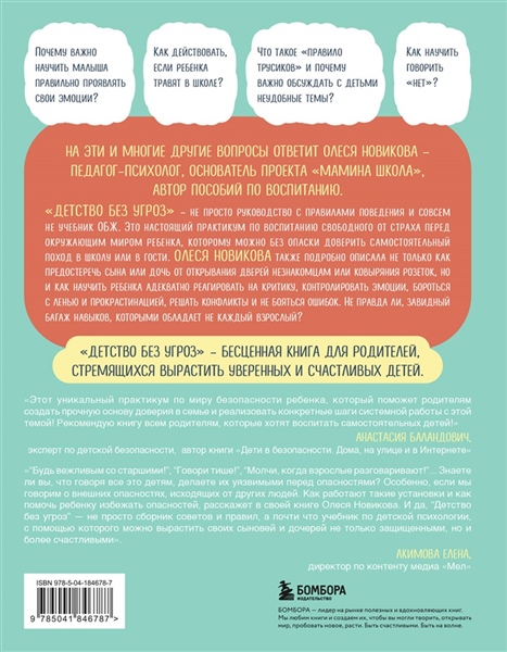 Эта книга — настоящий путеводитель для родителей, стремящихся вырастить уверенных и счастливых детей. Автор книги, Олеся Новикова, педагог, психолог и автор масштабного телепроекта «Мамина школа», предлагает детально разобрать тему детской безопасности, начиная с эмоционального благополучия в семье и предотвращения угроз психологическому здоровью ребенка, переходя к темам интимной безопасности и правилам поведения в школе, на улице, дома и в интернете. Автор расскажет: · Как научить детей распознавать эмоции и управлять ими. · Как укрепить нервную систему малыша. · Как мотивировать ребенка без давления, ссор и слез. · Как научить вести себя в коллективе, строить отношения с одноклассниками и что делать, если ребенка травят. · Как обезопасить свой дом, чтобы минимизировать риски несчастных случаев, и многое другое. Особое внимание в книге уделено современным вызовам — защите дома, безопасности в интернете,на улице и в школе. Каждая ситуация рассмотрена с практической точки зрения, чтобы родители могли легко применять советы в повседневной жизни. Также Олеся затрагивает тему сексуального воспитания и важности откровенных бесед с сыновьями и дочерьми. Эта книга не просто набор рекомендаций, а комплекс инструментов для мам и пап, которые помогут обеспечить безопасность и благополучие ваших детей.