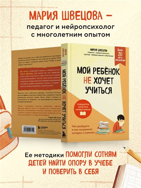 Можно ли сделать так, чтобы ваш ребёнок по-настоящему захотел учиться? Чтобы он сам садился за уроки? Чтобы горел от азарта, осваивая новую тему? Чтобы в классе первым тянул руку? Да, можно, утверждает педагог и нейропсихолог Мария Швецова. Уже много лет она избавляет семьи своих клиентов от ссор и слез из-за оценок и домашней работы. В этой книге автор делится методикой, которая помогает пробудить внутреннюю мотивацию, развить внимание и память, а главное - сделать учебу для ребенка увлекательной. Простые шаги, реальные примеры, понятная система - все это вернет в ваш дом спокойствие, доверие и желание школьника узнавать новое. Книга будет полезна вне зависимости от возраста, но особенно рекомендуется родителям младших школьников. «Книга, призванная наконец искоренить порочную практику деления детей на "успешных" и "двоечников", доступно объясняющая реальные причины сложностей в школе, а главное, дающая родителям понятные инструменты для работы с мотивацией ребенка». — Мария Шаталова, детский психолог, автор книги «Осторожно, это мои границы!»