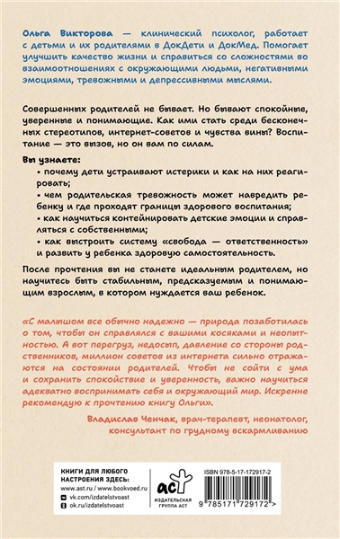 Ольга Викторова — клинический психолог, работает с детьми и их родителями в DocDeti и DocMed. Является членом Ассоциации когнитивно-поведенческой психотерапии и Ассоциации специалистов в сфере контекстуально-поведенческой науки. В своей работе использует такие подходы, как когнитивно-поведенческая терапия (КПТ), краткосрочная позитивная психотерапия, ориентированная на решения, а также терапия принятия и ответственности (АСТ). Помогает улучшить качество жизни и справиться со сложностями во взаимоотношениях с окружающими, негативными эмоциями, тревожными и депрессивными мыслями. Совершенных родителей не бывает. Но бывают спокойные, уверенные и понимающие. Как ими стать среди бесконечных стереотипов, интернет-советов и чувства вины? Воспитание — это вызов, но он вам по силам. Эта книга поможет вам разобраться с тем, что действительно важно, и окажет поддержку в сложный период взросления. Вы узнаете: • почему дети устраивают истерики и как на них реагировать; • чем родительская тревожность может навредить ребенку и где проходят границы здорового воспитания; • как научиться контейнировать детские эмоции и справляться с собственными; • что делать, если ребенок дерется, убегает, портит вещи или говорит обидные слова; • как выстроить систему "свобода — ответственность" и развить у ребенка здоровую самостоятельность. Эта книга не о том, как стать идеальным родителем, но о том, как стать стабильным, предсказуемым и понимающим взрослым, в котором нуждается ваш ребенок. Она поможет заложить прочный фундамент в отношениях с ребенком, основанный на доверии, а не на страхе. "С малышом все обычно надежно — природа позаботилась о том, чтобы он справлялся с вашими косяками и неопытностью. А вот перегруз, недосып, давление со стороны родственников, миллион советов из интернета сильно отражаются на состоянии родителей. Чтобы не сойти с ума и сохранить спокойствие и уверенность, важно научиться адекватно воспринимать себя и окружающий мир. Искренне рекомендую к прочтению книгу Ольги". (Владислав Ченчак, врач-терапевт, неонатолог, консультант по грудному вскармливанию)