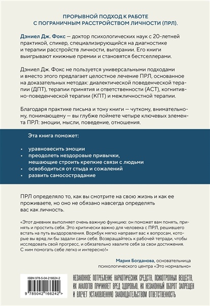 НЕЗАКОННОЕ ПОТРЕБЛЕНИЕ НАРКОТИЧЕСКИХ СРЕДСТВ, ПСИХОТРОПНЫХ ВЕЩЕСТВ, ИХ АНАЛОГОВ ПРИЧИНЯЕТ ВРЕД ЗДОРОВЬЮ, ИХ НЕЗАКОННЫЙ ОБОРОТ ЗАПРЕЩЕН И ВЛЕЧЕТ УСТАНОВЛЕННУЮ ЗАКОНОДАТЕЛЬСТВОМ ОТВЕТСТВЕННОСТЬ. «Этот дневник выполняет очень важную функцию: он поможет вам понять, принять и простить себя. Это критически важно для человека с ПРЛ, решившего встать на путь выздоровления. Воркбук мягко направит вас к вопросам, которые вы вряд ли бы задали сами себе. Возвращайтесь к рабочей тетради, чтобы исследовать свой прогресс, и обязательно хвалите себя за свои достижения. С ним помогать себе легко и интересно!» — Мария Богданова, основательница психологического центра «Это нормально» Эта книга с письменными практиками и заданиями для самопомощи поможет людям с ПРЛ уравновесить эмоции, освободиться от стыда и простить себя. Даже если ПРЛ и влияло на ваш образ мысли и вашу жизнь, оно не обязательно будет определять вас как личность. Дэниэл Дж. Фокс — доктор психологических наук с 20-летней практикой, спикер, специализирующийся на диагностике и терапии расстройств личности, выгорании. Его книги выигрывают книжные премии и становятся бестселлерами. Дэниэл Дж. Фокс предлагает целостное лечение ПРЛ, основанный на доказательных методах: диалектической поведенческой терапии (ДПТ), терапии принятия и ответственности (АСТ), когнитивно-поведенческой терапии (КПТ) и межличностной терапии.