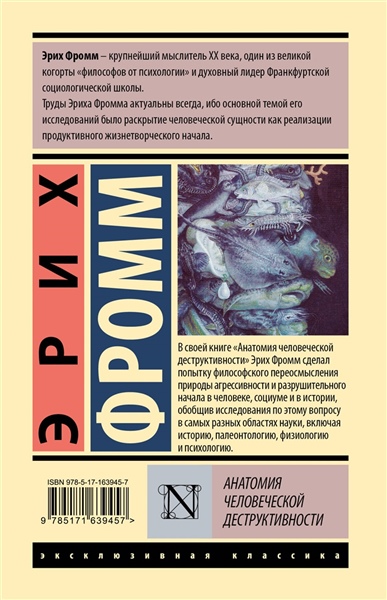 В своей книге "Анатомия человеческой деструктивности" Эрих Фромм сделал попытку философского переосмысления природы агрессивности и разрушительного начала в человеке,социуме и в истории, обобщив исследования по этому вопросу в самых разных областях науки, включая историю, палеонтологию, физиологию и психологию.