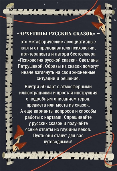 «Архетипы русских сказок» — это метафорические ассоциативные карты от преподавателя психологии, арт-терапевта и автора бестселлера «Психология русской сказки» Светланы Патрушевой. Образы из сказок помогут иначе взглянуть на свои жизненные ситуации и решения.