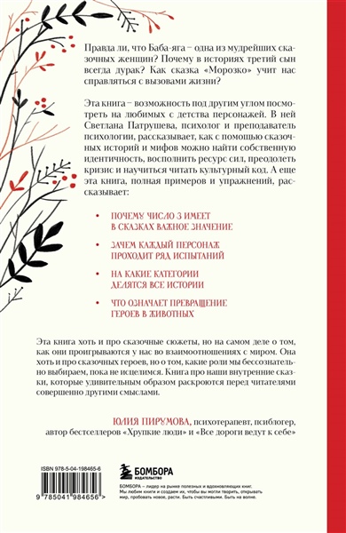 Правда ли, что Баба Яга — одна из мудрейших сказочных женщин? Почему в историях третий сын всегда дурак? Как сказка «Морозко» учит нас справляться с вызовами в жизни? Эта книга — возможность под новым углом посмотреть на любимых с детства персонажей. В ней Светлана Патрушева, психолог и преподаватель психологии, рассказывает, как с помощью сказочных историй и мифов можно найти собственную идентичность, восполнить ресурс сил, преодолеть кризис и научиться читать культурный код. А еще эта книга, полная примеров и упражнений, рассказывает: - Почему число 3 имеет для сказок важное значение. - Зачем каждый персонаж проходит ряд испытаний. - На какие категории делятся все истории. - Что означает превращение героев в животных.