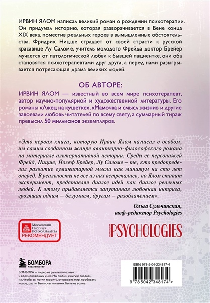 ИРВИН ЯЛОМ написал великий роман о рождении психотерапии. Он придумал историю, которая разворачивается в Вене конца XIX, поместив реальных героев в вымышленные обстоятельства. Фридрих Ницше страдает от своей страсти к русской красавице Лу Саломе, учитель молодого Фрейда доктор Брейер мучается от патологической любви к бывшей пациентке, они оба становятся психотерапевтами друг друга, а перед нами разыгрывается потрясающая драма великих людей. Этот роман основан на исторических фактах, но постепенно погружает нас в область фантазии, захватывая с такой силой, что реальность от придуманного сюжета уже не отличишь.
