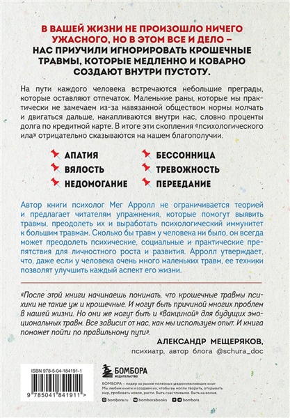«После этой книги начинаешь понимать, что крошечные травмы психики не такие уж и крошечные. И могут быть причиной многих проблем в нашей жизни. Но они же могут быть и "вакциной" для будущих эмоциональных травм. Все зависит от нас, как мы используем опыт. И книга поможет пойти по правильному пути». — Александр Мещеряков, психиатр, автор блога schura_doc