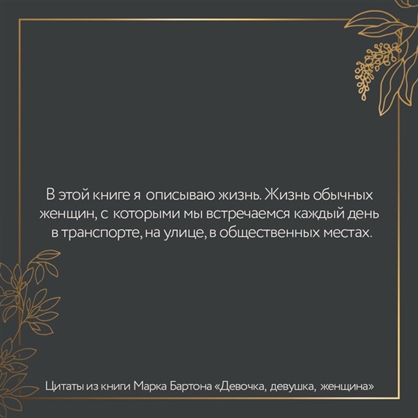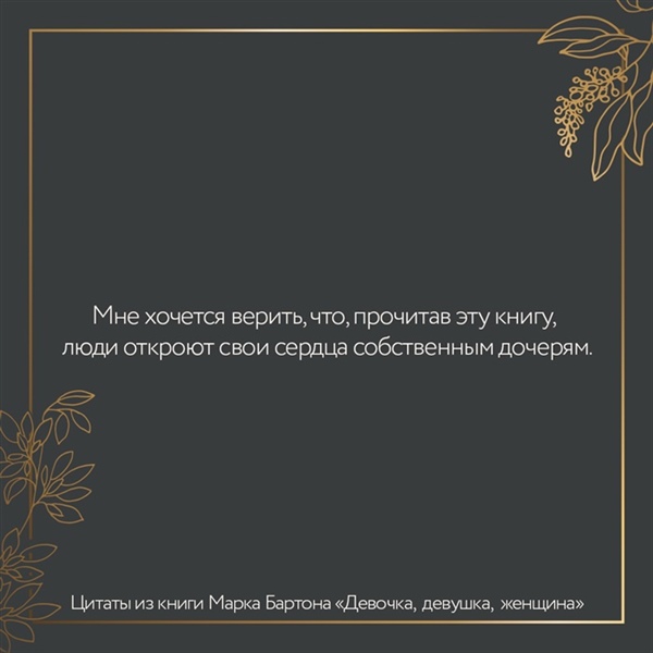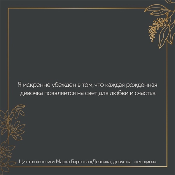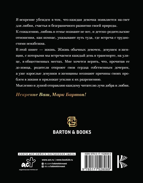 Я искренне убежден в том, что каждая девочка появляется на свет для любви, счастья и безграничного развития своей природы. К сожалению, любовь в семье познают не все и детско-родительские отношения, как компас, указывают путь туда, где встреча с трудностями неизбежна. В этой книге — жизнь. Жизнь обычных девочек, девушек и женщин, с которыми мы встречаемся каждый день в транспорте, на улице, в общественных местах. Мне хочется верить, что, прочитав ее до конца, родители откроют свои сердца собственным дочерям, а уже взрослые девушки и женщины осознают причины своих проблем в жизни и приложат усилия к их разрешению. Мысленно и душой отправляю каждому читателю лучи добра и любви. Искренне Ваш, Марк Бартон!
