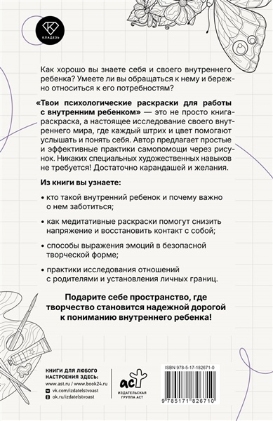 Как хорошо вы знаете себя и своего внутреннего ребенка? Умеете ли вы обращаться к нему и бережно относиться к его потребностям? "Твои психологические раскраски для работы с внутренним ребенком" — это не просто книга-раскраска, а настоящее исследование своего внутреннего мира, где каждый штрих и цвет помогают услышать и понять себя. Автор предлагает простые и эффективные практики самопомощи через рисунок. Никаких специальных художественных навыков не требуется! Достаточно карандашей и желания. Из книги вы узнаете: • кто такой внутренний ребенок и почему важно о нем заботиться; • как медитативные раскраски помогут снизить напряжение и восстановить контакт с собой; • способы выражения эмоций в безопасной творческой форме; • практики исследования отношений с родителями и установления личных границ. Подарите себе пространство, где творчество становится надежной дорогой к пониманию внутреннего ребенка!
