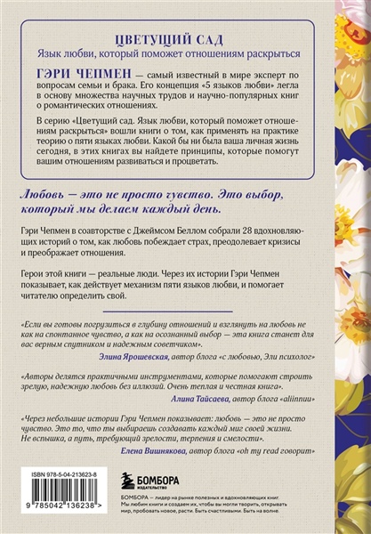 В новой книге Гэри Чепмена, эксперта по отношениям с 40-летним стажем и автора концепции пяти языков любви, собрано 28 историй жизни реальных людей о том, как они учились выражать свою любовь, переживая трагедию, боль, триумф. В конце каждой истории Чепмен объясняет, как в этом случае применить на практике его легендарную теорию пяти языков любви. Для кого эта книга: - Для пар, которые хотят укрепить отношения. - Для родителей, желающих построить доверительные отношения с детьми. - Для тех, кто устал от конфликтов и хочет научиться любить осознанно. - А также для тех, кому нравятся вдохновляющие истории о любви.