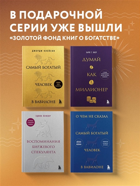 Из нее вы узнаете, почему одним суждено быть богатыми, а другим — бороться за существование. Вы поймете истинные причины успеха, среднего достатка и финансовых неудач и начнете менять свое финансовое будущее к лучшему. Узнаете, как детские впечатления влияют на нашу финансовую программу, как они приводят к пораженческим настроениям и привычкам. Вы познакомитесь с «волшебными» декларациями, и благодаря им на смену пессимистическому образу мыслей придет «богатое мышление». И вы будете думать (и преуспевать) так же, как это делают богатые люди. Кроме того, вы познакомитесь с практическими поэтапными методами увеличения дохода и достижения материального благополучия.