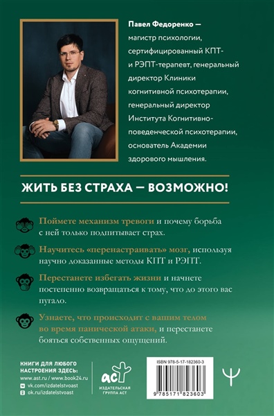 Павел Федоренко — магистр психологии, сертифицированный КПТ- и РЭПТ-терапевт, генеральный директор Клиники когнитивной психотерапии, генеральный директор Института Когнитивно-поведенческой психотерапии, основатель Академии здорового мышления. Сердце колотится, воздуха не хватает, ноги подкашиваются — и все это посреди обычного дня, в очереди, в магазине, в метро, дома… Вы уже устали жить с мыслью "что-то не так", готовиться к "самому страшному" и носить с собой корвалол "на всякий случай"? Эта книга — ваш пошаговый план освобождения. Автор, Павел Федоренко, психолог и психотерапевт, человек, прошедший через ад панических атак и агорафобии, за годы практики помог тысячам людей вернуть контроль над жизнью. В книге "Человек тревожный" вы найдете пошаговый план, созданный на основе когнитивно-поведенческой терапии (КПТ) и рационально-эмоциональной поведенческой терапии (РЭПТ) и адаптированный для самостоятельной работы. Вы научитесь принимать тревогу, а не бороться с ней, перенастроите реакции мозга и вернете себе свободу жить — без паники, ложных страхов и ограничений. • Поймете механизм тревоги и почему борьба с ней только подпитывает страх. • Научитесь "перенастраивать" мозг, используя научно доказанные методы КПТ и РЭПТ. • Перестанете избегать жизни и начнете постепенно возвращаться к тому, что до этого вас пугало. • Узнаете, что происходит с вашим телом во время панической атаки, и перестанете бояться собственных ощущений.