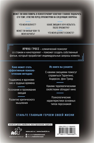 Может ли кино помочь в психотерапии? Конечно! Главное подобрать его тему, ответив перед просмотром на следующие вопросы: • Что меня волнует? • Может ли фильм чему-то меня научить? • Какие эмоции я хочу испытать после просмотра? • Что меня цепляет в сюжете? Ирина Гросс - клинический психолог со стажем и кинотерапевт - поможет создать собственный фильм, который проработает индивидуальные запросы клиента. Кино может стать эффективным психологическим методом: поддержка и вдохновение в трудные времена, осознание и проживание эмоций, развитие критического мышления. Из книги вы узнаете: •С какими эмоциями помогут справиться Тарантино, Андерсон, фон Триер; •Какими терапевтическими свойствами обладает кино; •Психологические характеристики типов персонажей. Станьте главным героем своей жизни!