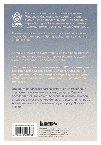 «Сегодня я сделаю перерыв» — это 82 послания для тех, кто поставил свою жизнь на автопилот, вечно откладывает себя на потом и каждый день твердит: «Мне некогда отдыхать, жить, любить, радоваться, мечтать».
