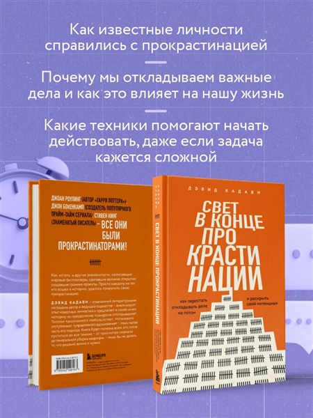 Джоан Роулинг (автор "Гарри Поттера"), Джон Бокенкамп (создатель популярного прайм-тайм сериала), Стивен Кинг (знаменитый писатель) – все они были прокрастинаторами. Как, кстати, и другие знаменитости, написавшие мировые бестселлеры, сделавшие великие открытия, создавшие громкие проекты. Просто каждому из тех, кто вошел в историю, удалось приручить свою прокрастинацию. Дэвид Кадави – отмеченный литературными наградами автор и ведущий подкастов – анализирует опыт известных личностей и предлагает в своей книги методику по преодолению "синдрома откладывания". Техники "осознанного любопытства", "планового отступления", "управляемого вдохновения" – лишь малая часть его подхода. Книга будет полезна всем, кто готов пуститься во все тяжкие – от просмотра сериала до генеральной уборки квартиры – лишь бы не делать то, что реально важно и нужно.