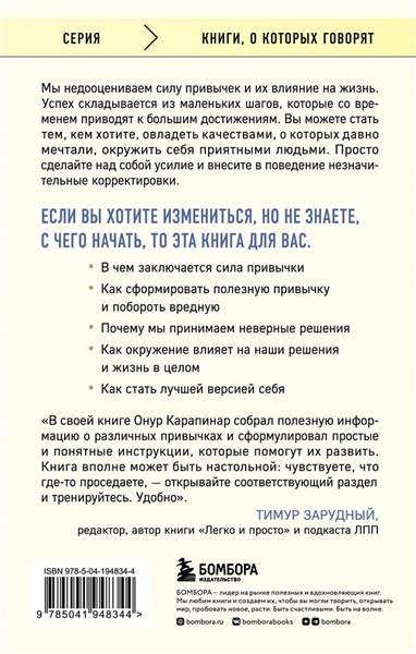 Всё начинается с наших привычек. После нескольких лет исследований автор и успешный предприниматель Онур Карапинар объясняет, как создание небольших привычек позволит добиться больших успехов в долгосрочной перспективе. Всего несколько минут в день позволят вырваться из замкнутого круга и перенаправить свою энергию в нужное русло.