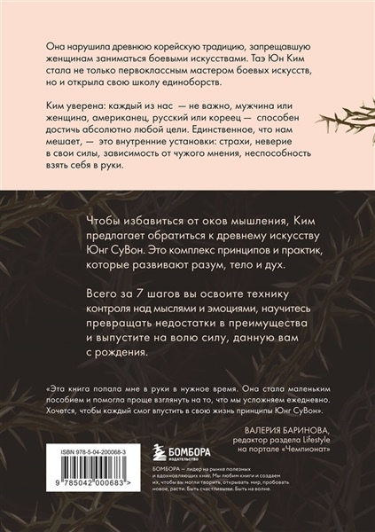 Когда разум захламлён суетой, тревогой и плохими мыслями — наша энергия рассеивается. Это происходит снова и снова, и мы становимся слабыми и неэффективными. Более того, в такой ситуации мы не можем быть честными с собой. Цель искусства Чунсувон — дать практические инструменты, благодаря которым вы сможете освободиться от ограничивающих, пагубных состояний ума, взглянуть на себя с разных сторон и пробудить свой невероятный потенциал к созданию жизни. Цитаты «ХРАНИ ВЕРНОСТЬ СВОИМ ЦЕЛЯМ, ОСОБЕННО КОГДА ВСЕ КАЖЕТСЯ БЕЗНАДЕЖНЫМ». «МЫ МОЖЕМ МНОГОМУ НАУЧИТЬСЯ У ПРИРОДЫ, ВНИМАТЕЛЬНО НАБЛЮДАЯ ЗА ЕЕ КРАСОТОЙ И СИЛОЙ». «НАМ ТАК ЧАСТО ХОЧЕТСЯ СДАТЬСЯ ВСЕГО В ОДНОМ ШАГЕ ОТ УСПЕХА. НО ЕСЛИ УПОРНО И НАСТОЙЧИВО ТРУДИТЬСЯ, ДВЕРИ ОТКРОЮТСЯ». «НАСТОЯЩИЙ ПУТЬ ВОИНА — ГОРАЗДО БОЛЬШЕ, ЧЕМ ПОБЕДА НА СОРЕВНОВАНИИ». «ЕСЛИ БУДЕШЬ СРАВНИВАТЬ СЕБЯ С ДРУГИМИ, ТЫ УПУСТИШЬ ВОЗМОЖНОСТЬ НАЙТИ И РАЗВИТЬ СВОИ ЛУЧШИЕ КАЧЕСТВА И СИЛЬНЫЕ СТОРОНЫ». Об авторе Доктор Тэюн Ким — великий мастер боевых искусств, писательница и мотивационный спикер. Она начала тренироваться в возрасте семи лет, нарушив тысячелетнюю традицию, запрещавшую девочкам в Южной Корее изучать боевые искусства. Несмотря ни на что, Тэюн Ким стала первым мастером боевых искусств в Корее и одной из величайших мастеров боевых искусств в мире. В качестве главного тренера она привела первую в истории американскую женскую команду по тхэквондо к золотой медали на международных играх в Сеуле и помогла проложить путь женщинам на соревнования по боевым искусствам в рамках Олимпийских игр. Доктор Ким основала собственную школу боевых искусств, нацеленную на преодоление препятствий во всех сферах жизни. Преподает в своей академии в заливе Сан-Франциско. Также основала и возглавила ведущую технологическую компанию в Кремниевой долине и получила множество наград за выдающиеся достижения в гуманитарной сфере. Отзыв «Эта книга попала мне в руки в нужное время. Она стала маленьким пособием, как проще взглянуть на то, что мы усложняем ежедневно. Хочется, чтобы каждый смог впустить в свою жизнь принципы Юнг СуВон». — Валерия Баринова, редактор раздела Lifestyle на портале «Чемпионат»
