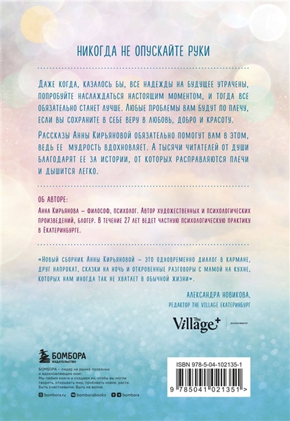 Никогда не опускайте руки. Даже когда, казалось бы, все надежды на будущее утрачены, попробуйте наслаждаться настоящим моментом, и тогда все обязательно станет лучше. Любые проблемы вам будут по плечу, если вы сохраните в себе веру в любовь, добро и красоту. Рассказы Анны Кирьяновой обязательно помогут вам в этом, ведь еемудрость вдохновляет. А тысячи читателей от души благодарят ее за истории, от которых расправляются плечи и дышится легко.