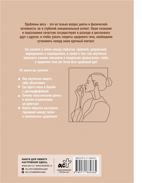 Проблемы веса – это не только вопрос диеты и физической активности, но и глубокий эмоциональный аспект. Наши сознание и подсознание зачастую сосуществуют в разладе и диссонансе друг с другом, и чтобы узнать секреты здорового тела, необходимо установить между ними прочный контакт. Вы узнаете о связи между стрессом, тревогой, депрессией, перееданием и недоеданием, а также о том, как научиться управлять своими эмоциями и пищевыми привычками, чтобы в здоровом теле уж точно был здоровый дух!