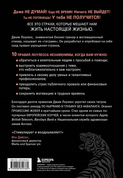 Жить легко и свободно нам мешают наши страхи. Они, словно тигры, рычат: "даже не думай пробовать", "откажись, все равно ничего не выйдет", "еще не время". И мы слушаем. И мы отступаем. Откладываем свою мечту и жизнь в долгий ящик. Джим Лоулесс — бизнес-тренер, один из самых популярных европейских мотивационных спикеров. В числе его клиентов — Apple, British Telecom, Barclays Bank и Национальная служба здравоохранения Англии. Стал первым британским фридайвером, установившим рекорд по нырянию в глубину без акваланга. За 12 месяцев освоил профессию жокея. Всего этого он добился благодаря 10 правилам, которые сам изобрел и опробовал на себе.