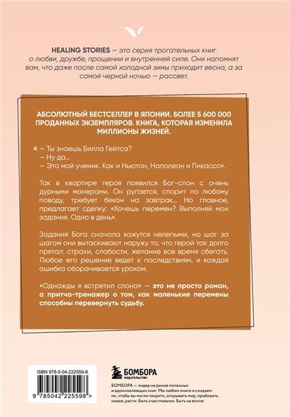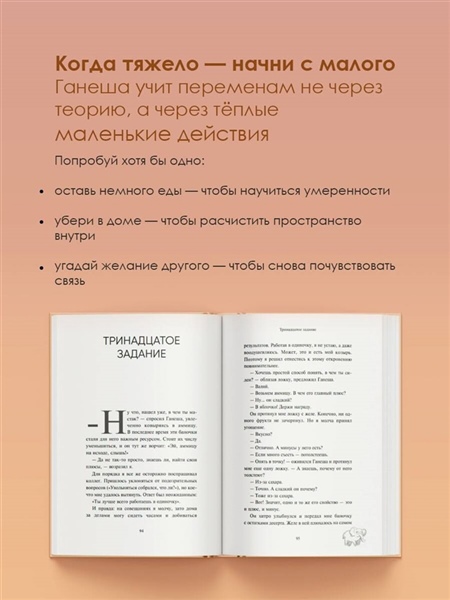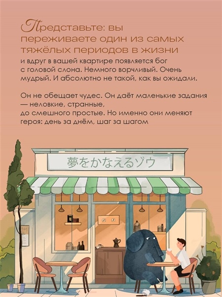 Абсолютный бестселлер в Японии. Более 5 600 000 проданных экземпляров. Книга, которая изменила миллионы жизней. «— Ты знаешь Билла Гейтса? — Ну да… — Это мой ученик. Как и Ньютон, Наполеон и Пикассо». Так представился мой новый сосед — бог с головой слона и очень дурными манерами. Он ругается, спорит по любому поводу, требует бекон на завтрак… Но главное, предлагает сделку: «Хочешь перемен? Выполняй мои задания. Одно в день». Смешные и нелепые поручения неожиданно становятся шагами к переменам. Ганеша оказывается зеркалом слабостей, которое помогает увидеть самое главное — как услышать себя и наконец решиться жить по-настоящему.