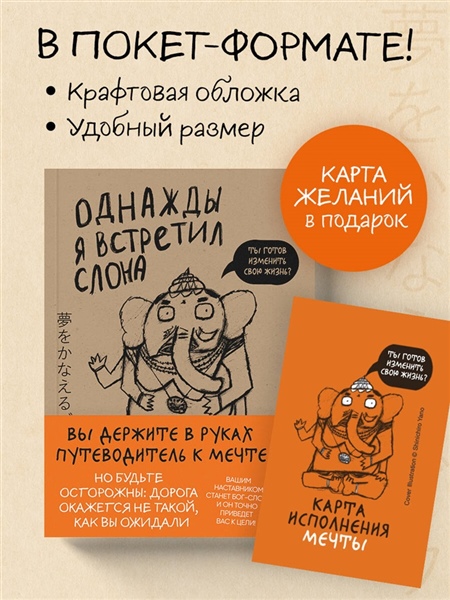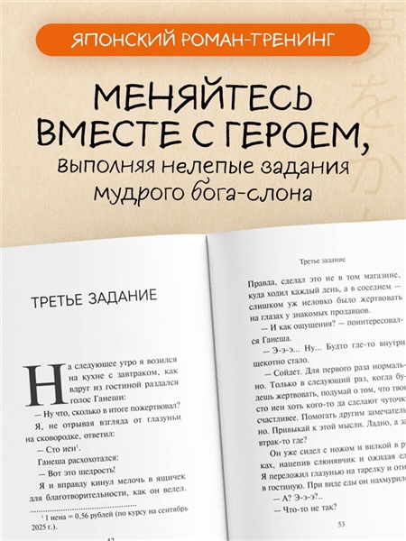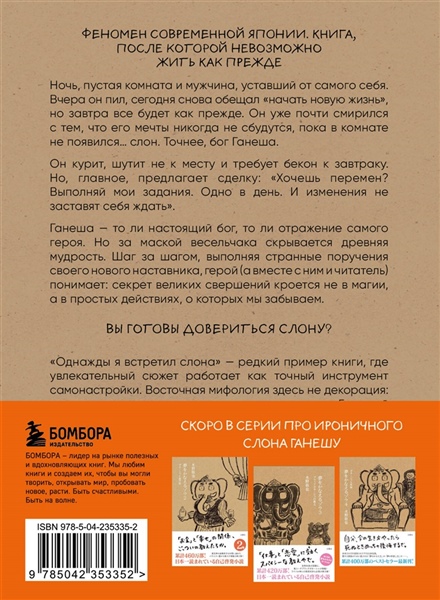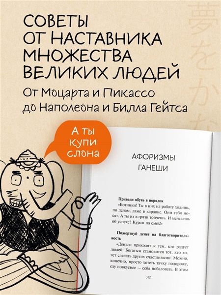 Абсолютный бестселлер в Японии. Более 5 600 000 проданных экземпляров. Книга, которая изменила миллионы жизней. Права проданы в 7 стран. «— Ты знаешь Билла Гейтса? — Ну да… — Это мой ученик. Как и Ньютон, Наполеон и Пикассо». Так представился мой новый сосед — бог с головой слона и очень дурными манерами. Он ругается, спорит по любому поводу, требует бекон на завтрак… Но главное, предлагает сделку: «Хочешь перемен? Выполняй мои задания. Одно в день. И твоя жизнь точно изменится». Смешные и нелепые поручения неожиданно становятся шагами к переменам. Ганеша оказывается зеркалом слабостей, которое помогает увидеть самое главное — как услышать себя и наконец решиться жить по-настоящему.