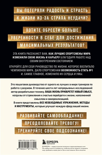 Вы потеряли радость и страсть к жизни из-за страха неудачи? Хотите обрести больше уверенности в себе для достижения максимальных результатов? Эта книга расскажет вам, лучшие спортсмены мира изменили свою жизнь и карьеру благодаря работе над своим внутренним состоянием. Ваша жизнь приобретет новый смысл, когда вы перейдете от стремления к счастью к жизни, наполненной смыслом и самореализацией. В книге представлены все необходимые упражнения, методы и инструменты, которые улучшат каждую сферу вашей жизни. РАЗВИВАЙТЕ САМОБЛАДЕНИЕ! ПРЕОДОЛЕВАЙТЕ ТРЕВОГУ! ТРЕНИРУЙТЕ СВОЕ ПОДСОЗНАНИЕ!