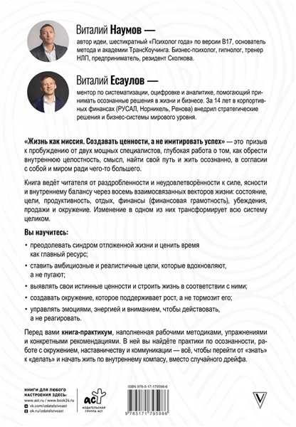 "Жизнь как миссия. Создавать ценности, а не имитировать успех" — этопризыв к пробуждению от двух мощных специалистов, глубокая работа о том, как обрести внутреннюю целостность, смысл, найти свой путь и жить осознанно, в согласии с собой и миром ради чего-то большего.