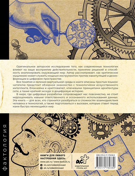 Оригинальное авторское исследование того, как современные технологии влияют на наше восприятие действительности, принятие решений и способность анализировать окружающий мир. Автор рассматривает, как критическое мышление может служить мощным инструментом против манипуляций и дезинформации в цифровом пространстве. Все понятия и явления виртуальной среды в книге описаны простым языком: читателю предстоит обзорное знакомство с технологиями искусственного интеллекта, блокчейна и криптовалют, ключевыми принципами архитектуры сети, а также краткий экскурс в доцифровую историю. В мире, где цифровые разработки сопровождают нас повсеместно, не стоит недооценивать навыки ответственного и осознанного использования данных. Эта книга — для всех, кто стремится разобраться в сложностях взаимодействия человека и технологий, а также подготовиться к вызовам, которые ставит перед нами быстро меняющийся мир.
