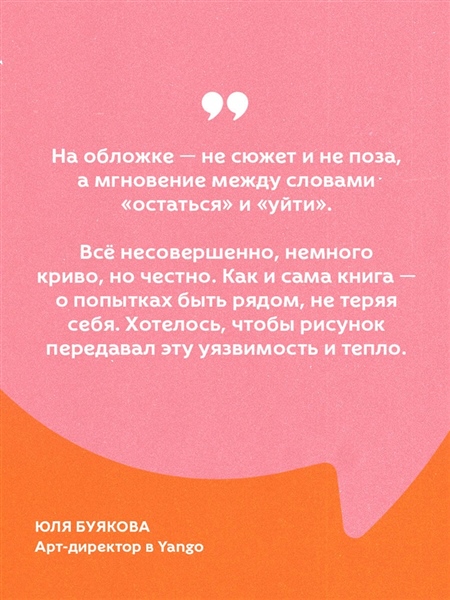 «На обложке — не сюжет и не поза, а мгновение между словами "остаться" и "уйти". Всё несовершенно, немного криво, но честно. Как и сама книга — о попытках быть рядом, не теряя себя. Хотелось, чтобы рисунок передавал эту уязвимость и тепло». — ЮЛЯ БУЯНОВА, арт-директор в Yango