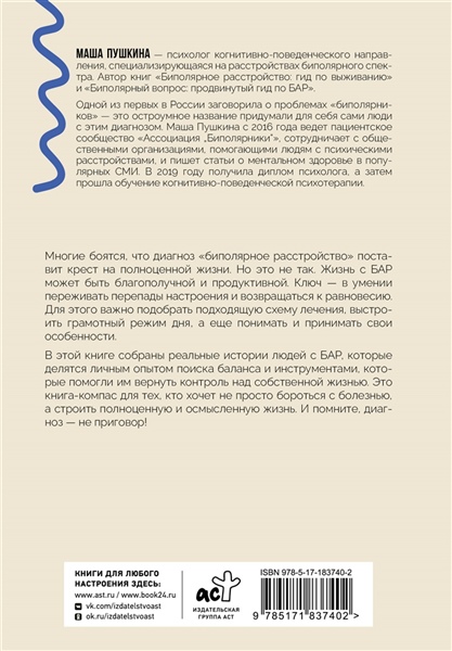 Маша Пушкина — психолог когнитивно-поведенческого направления, специализирующаяся на расстройствах биполярного спектра. Автор книг "Биполярное расстройство: гид по выживанию" и "Биполярный вопрос: продвинутый гид по БАР". Одной из первых в России заговорила о проблемах "биполярников" — это остроумное название придумали для себя сами люди с этим диагнозом. Маша Пушкина с 2016 года ведет пациентское сообщество "Ассоциация "Биполярники"", сотрудничает с общественными организациями, помогающими людям с психическими расстройствами, и пишет статьи о ментальном здоровье в популярных СМИ. В 2019 году получила диплом психолога, а затем прошла обучение когнитивно-поведенческой психотерапии. Многие боятся, что диагноз "биполярное расстройство" поставит крест на полноценной жизни. Но это не так. Жизнь с БАР может быть благополучной и продуктивной. Ключ — в умении переживать перепады настроения и возвращаться к равновесию. Для этого важно подобрать подходящую схему лечения, выстроить грамотный режим дня, а еще понимать и принимать свои особенности. В этой книге собраны реальные истории людей с БАР, которые делятся личным опытом поиска баланса и инструментами, которые помогли им вернуть контроль над собственной жизнью. Это книга-компас для тех, кто хочет не просто бороться с болезнью, а строить полноценную и осмысленную жизнь. И помните, диагноз — не приговор!