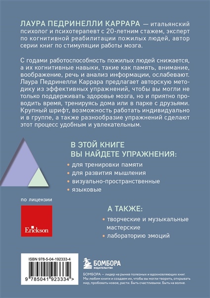 С годами работоспособность пожилых людей снижается, а их когнитивные навыки, такие как память, внимание, воображение, речь и анализ информации, ослабевают. Лаура Педринелли Каррара предлагает авторскую методику из эффективных упражнений, чтобы вы могли не только поддерживать здоровье мозга, но и приятно проводить время, тренируясь дома или в парке с друзьями. Крупный шрифт, возможность работать индивидуально и в группе, а также разнообразие упражнений, сделают этот процесс удобным и увлекательным. В ЭТОЙ КНИГЕ ВЫ НАЙДЕТЕ УПРАЖНЕНИЯ: - для тренировки памяти; - для развития мышления; - визуально-пространственные; - языковые. А ТАКЖЕ: - творческие и музыкальные мастерские; - лабораторию эмоций. Об авторе Лаура Педринелли Каррара — итальянский психолог и психотерапевт с 20-летним стажем, эксперт по когнитивной реабилитации пожилых людей, автор серии книг по стимуляции работы мозга.